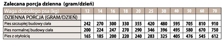 Zalecane dzienne spożycie karmy (patrz tabela) można podzielić na 2 posiłki dziennie. Indywidualne wymagania żywieniowe mogą się różnić w zależności od wielkości, wieku i poziomu aktywności zwierzęcia. Świeża i czysta woda powinna być dostępna przez cały czas. W przypadku zastąpienia tego produktu innym rodzajem paszy i/lub diety zaleca się wprowadzanie go stopniowo przez okres co najmniej 1 tygodnia. Tylko karma dla psów, nie nadaje się do spożycia przez ludzi.