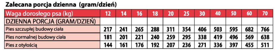 INSTRUKCJA PODANIA: Zalecane dzienne spożycie karmy (patrz tabela) można podzielić na 2 posiłki dziennie. Indywidualne wymagania żywieniowe mogą się różnić w zależności od wielkości, wieku i poziomu aktywności zwierzęcia. Świeża i czysta woda powinna być dostępna przez cały czas. W przypadku zastąpienia tego produktu innym rodzajem paszy i/lub diety zaleca się wprowadzanie go stopniowo przez okres co najmniej 1 tygodnia. Tylko karma dla psów, nie nadaje się do spożycia przez ludzi.