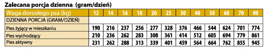 INSTRUKCJA PODANIA: Zalecane dzienne spożycie karmy (patrz tabela) można podzielić na 2 posiłki dziennie. Indywidualne wymagania żywieniowe mogą się różnić w zależności od wielkości, wieku i poziomu aktywności zwierzęcia. Upewnij się, że zwierzę zawsze ma dostęp do czystej i świeżej wody. W przypadku zastąpienia tego produktu innym rodzajem paszy i/lub diety zaleca się wprowadzanie go stopniowo przez okres co najmniej jednego tygodnia. *Może zawierać śladowe ilości innego źródła białka. Tylko karma dla zwierząt, nie nadaje się do spożycia przez ludzi.