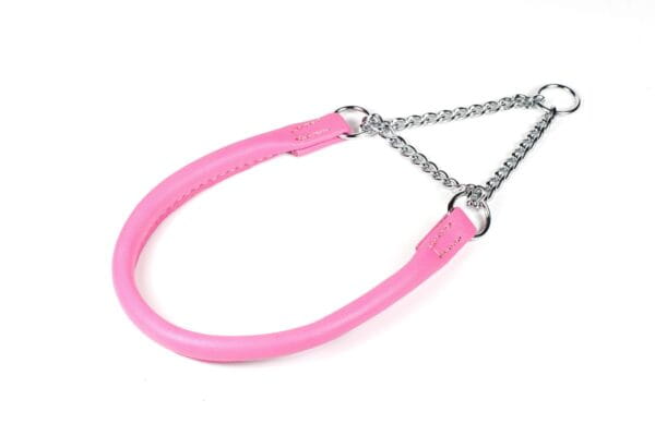 Profesjonalna obroża pół zaciskowa wykonana z wyjątkowo miękkiej, naturalnej skóry w eleganckim, Różowym kolorze. Wnętrze obroży wzmacnia rdzeń z nylonowej linki, który zapewnia wysoką wytrzymałość i odporność na rozciąganie, nie tracąc przy tym elastyczności i komfortu dla psa.