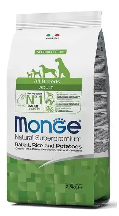 Pełnowartościowa karma Superpremium Adult z królikiem, ryżem i ziemniakami dla psa 2,5kg - marki MONGE