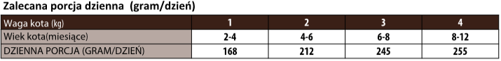 Zalecane dzienne spożycie karmy (patrz tabela) można podzielić na 2 posiłki dziennie. Indywidualne wymagania żywieniowe mogą się różnić w zależności od wielkości, wieku i poziomu aktywności zwierzęcia. Świeża i czysta woda powinna być dostępna przez cały czas. W przypadku zastąpienia tego produktu innym rodzajem paszy i/lub diety zaleca się wprowadzanie go stopniowo przez okres co najmniej 1 tygodnia. Tylko karma dla psów, NIE nadaje się do spożycia przez ludzi.