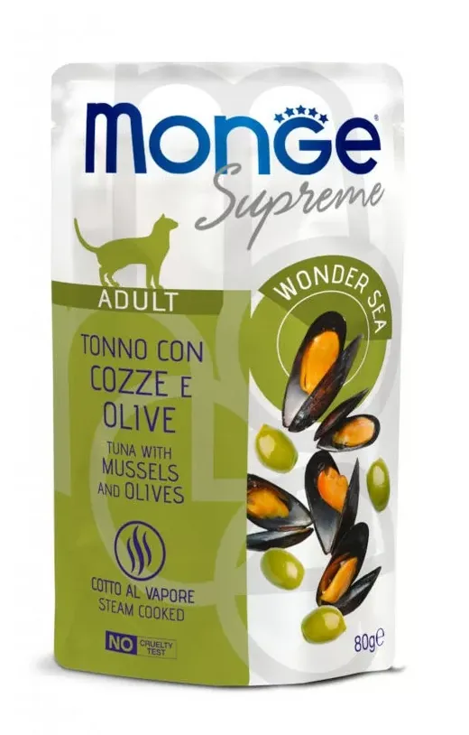 Saszetka dla kota Supreme ADULT Tuńczyk z małżami i oliwkami 80g - marki MONGE