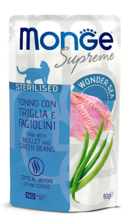 Saszetka dla kota Supreme Sterilised Tuńczyk z barweną i zieloną fasolą 80g - marki MONGE