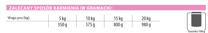 Podawać w temperaturze pokojowej. Dzienna porcja 5-6 saszetek dla dorosłego psa 10kg, podzielone na dwa posiłki. Zwierzę powinno mieć zawsze dostęp do świeżej i czystej wody. Otwarte opakowanie przechowywać w lodówce i użyć w terminie dwóch dni.