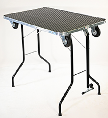 Stół bardzo szybko się składa i rozkłada - służą do tego 2 przyciski z zatrzaskami. Dzięki temu stół groomerski zyskał uznanie wielu hodowców i często jest spotykany na wystawach.