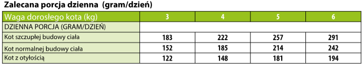 Zalecane dzienne spożycie karmy (patrz tabela) można podzielić na 2 posiłki dziennie. Indywidualne wymagania żywieniowe mogą się różnić w zależności od wielkości, wieku i poziomu aktywności zwierzęcia. Świeża i czysta woda powinna być dostępna przez cały czas. W przypadku zastąpienia tego produktu innym rodzajem paszy i/lub diety zaleca się wprowadzanie go stopniowo przez okres co najmniej 1 tygodnia. Tylko karma dla psów, NIE nadaje się do spożycia przez ludzi.