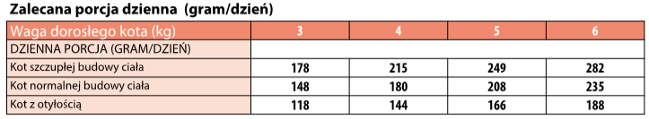 Zalecane dzienne spożycie karmy (patrz tabela) można podzielić na 2 posiłki dziennie. Indywidualne wymagania żywieniowe mogą się różnić w zależności od wielkości, wieku i poziomu aktywności zwierzęcia. Świeża i czysta woda powinna być dostępna przez cały czas. W przypadku zastąpienia tego produktu innym rodzajem paszy i/lub diety zaleca się wprowadzanie go stopniowo przez okres co najmniej 1 tygodnia. Tylko karma dla psów, NIE nadaje się do spożycia przez ludzi.